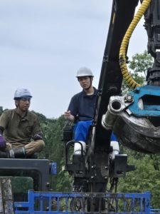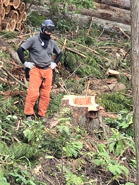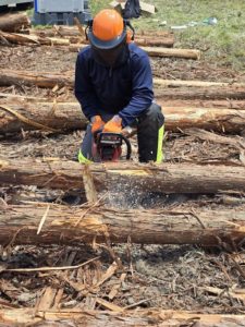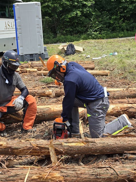 プロセッサやフォワーダ、グラップルを操作したり、チェンソーで木を切ったりしました。 また、実際に木の伐採を見学しました。