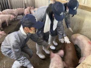 その後、愛農会(農業系進路を目指す生徒の会)のメンバーが同社大仙農場を訪れ、豚の導入や飼育の様子を見学しました。実習では体験できない飼育頭数や飼育方法について学びを深めることができました。